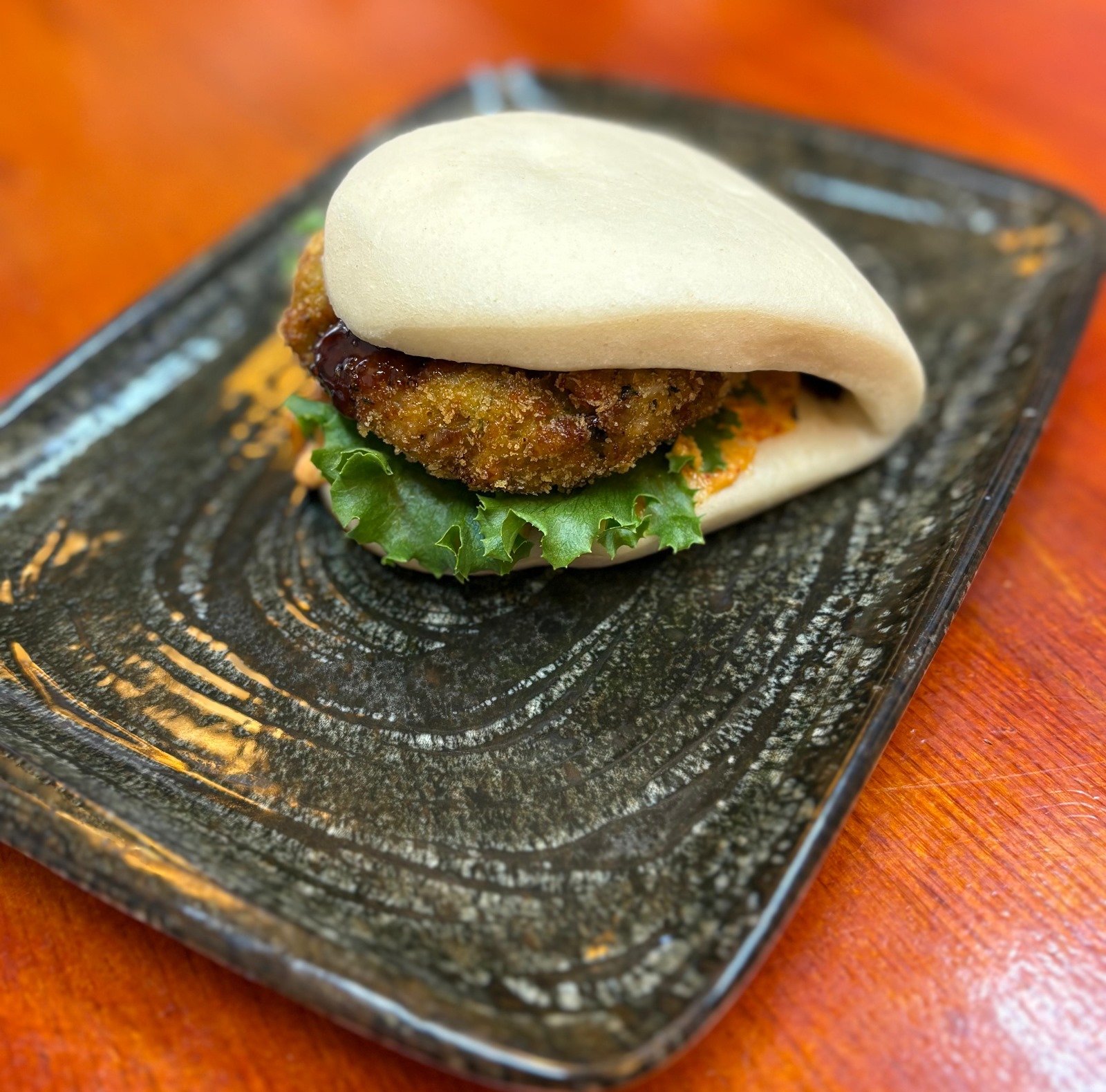 לחמנייה באן מאודה בתוספת קציצת דג ,לבבות קיסר ורוטבים על בסיס מיונז וטריאקי