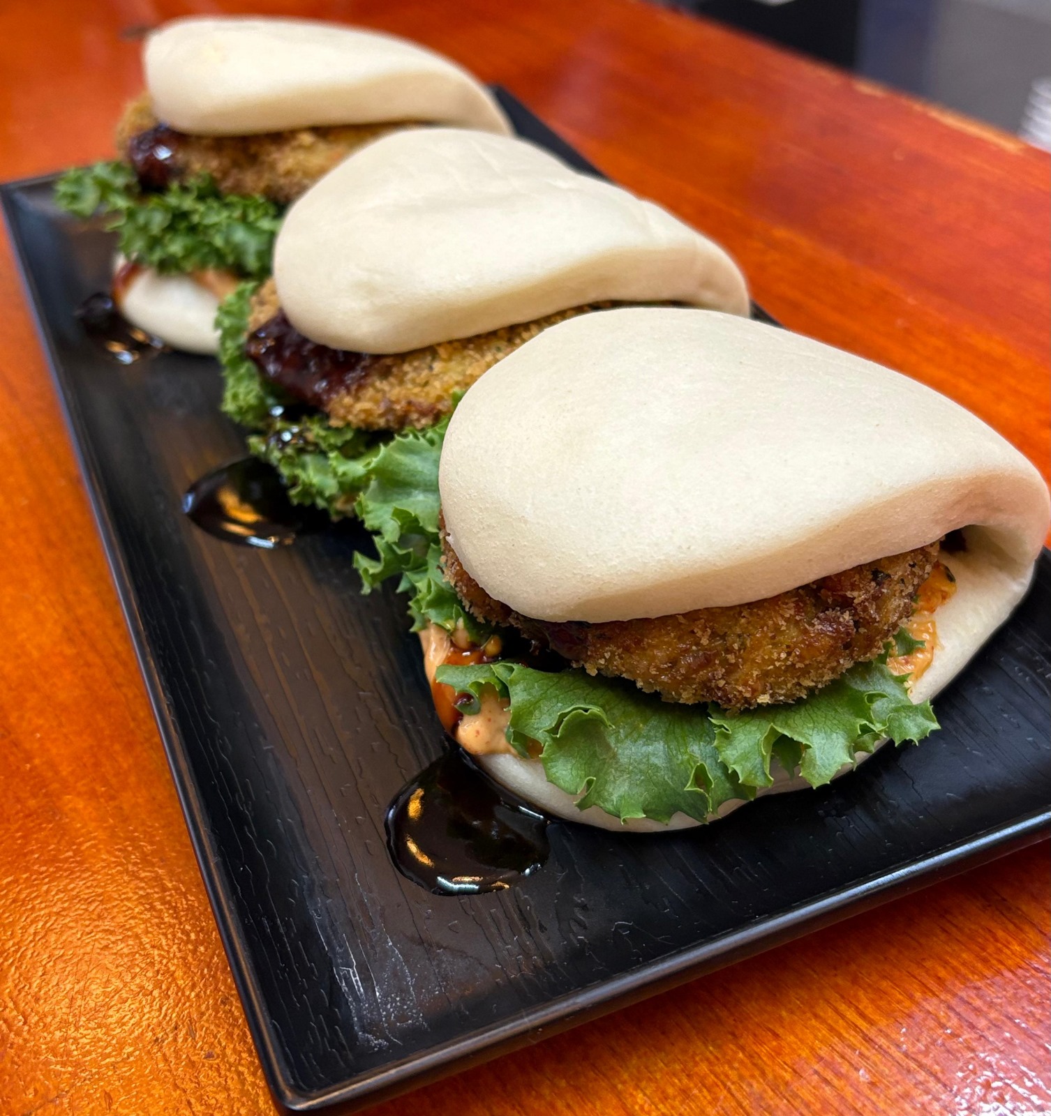 לחמנייה באן מאודה בתוספת קציצת דג ,לבבות קיסר ורטבים על בסיס מיונז וטריאקי