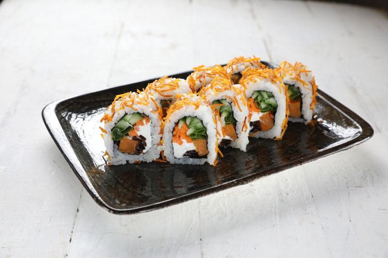 Сыр тофу, шиитаке, батат, огурец, тунец и зеленый лук.