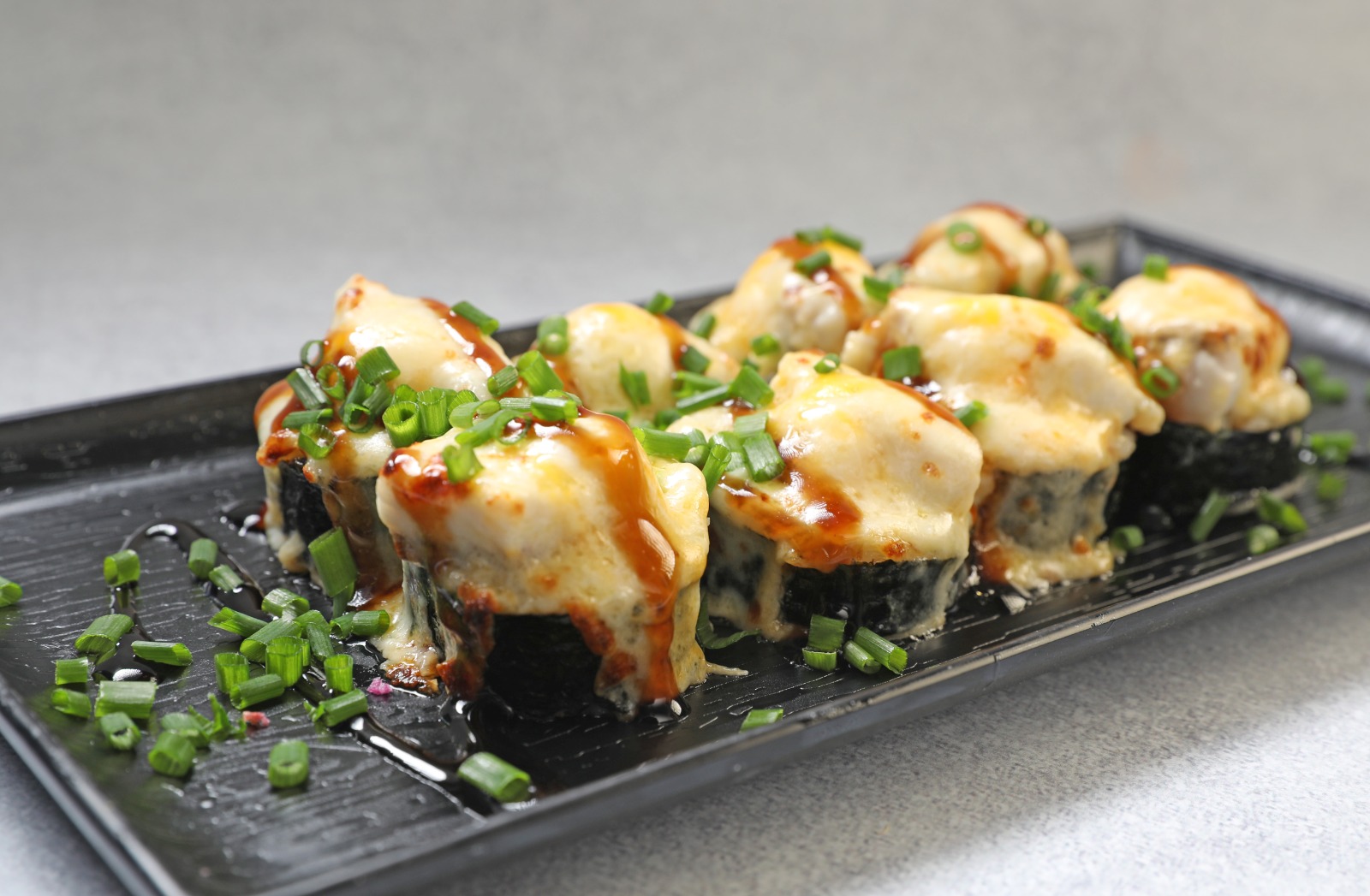Ролл маки с сливочным сыром “Филадельфия” листом салата масло мяты рыбой дорадо приправленный микс из 5 видов сыра