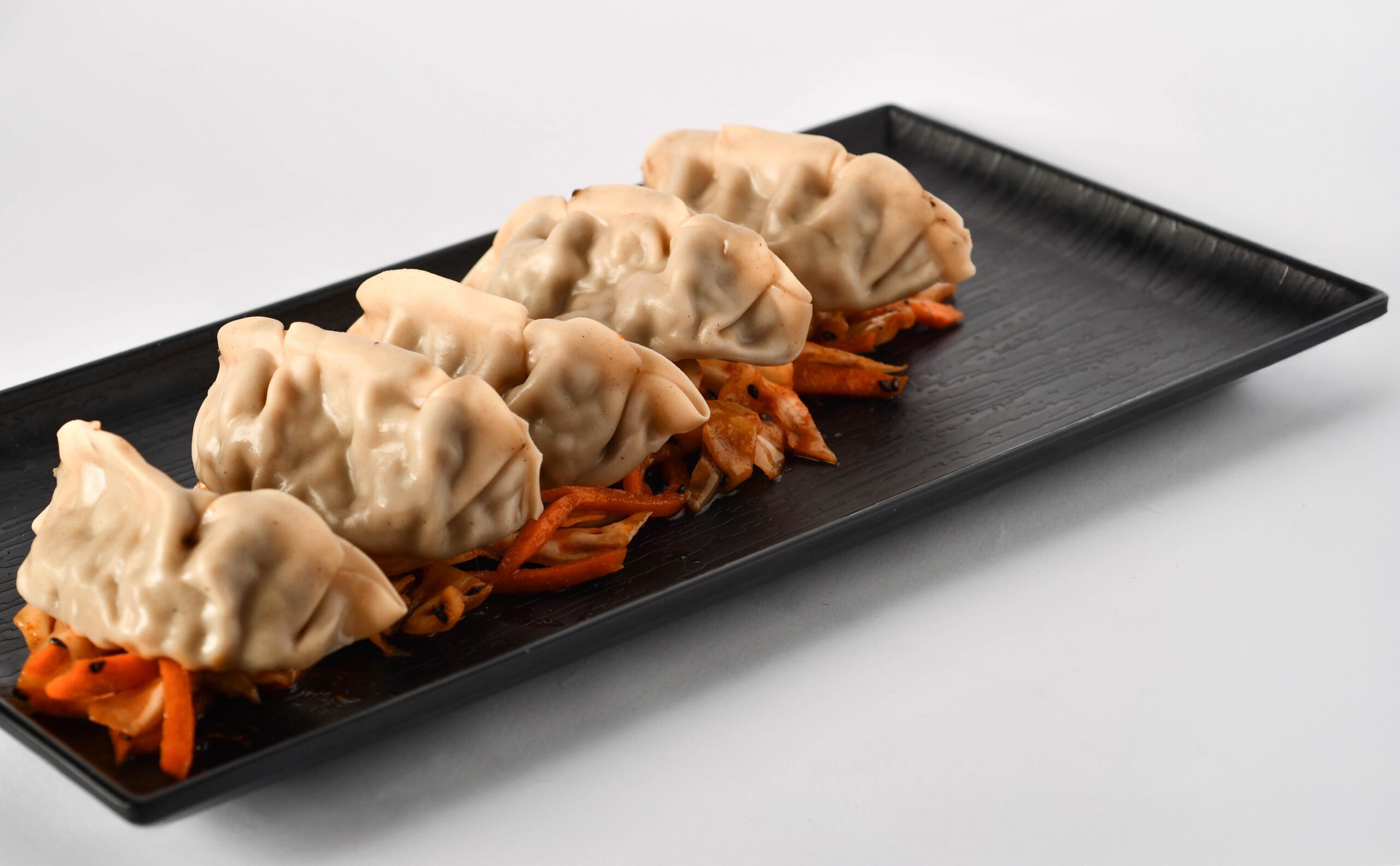 5 шт. изысканных гёдза с насыщенной грибной начинкой шиитаке, подаются на ложе из ароматных пропаренных овощей.