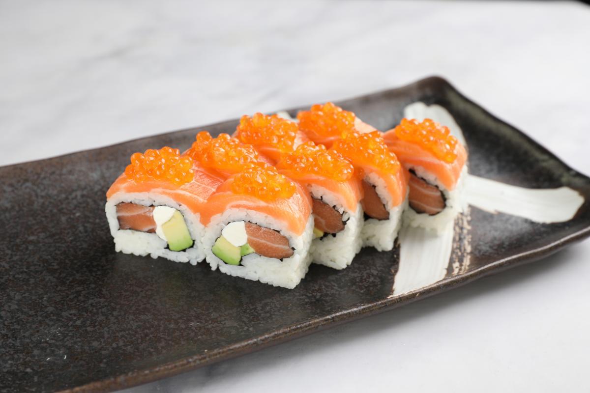 Нежный лосось, авокадо, сыр “Филадельфия”, покрытый лососем и красной икрой