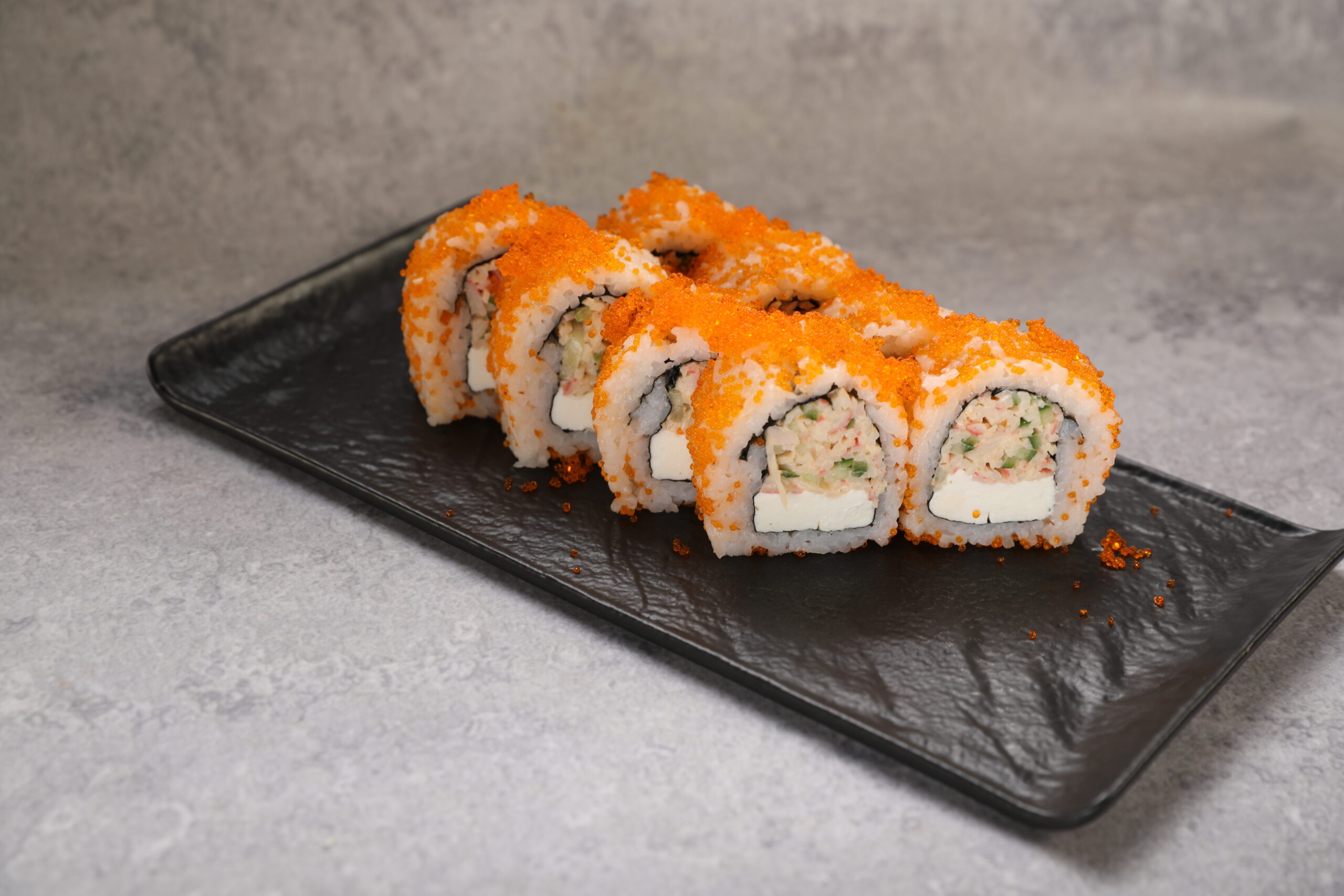 Сурими, огурец, сыр “Филадельфия” красная икра тобико.