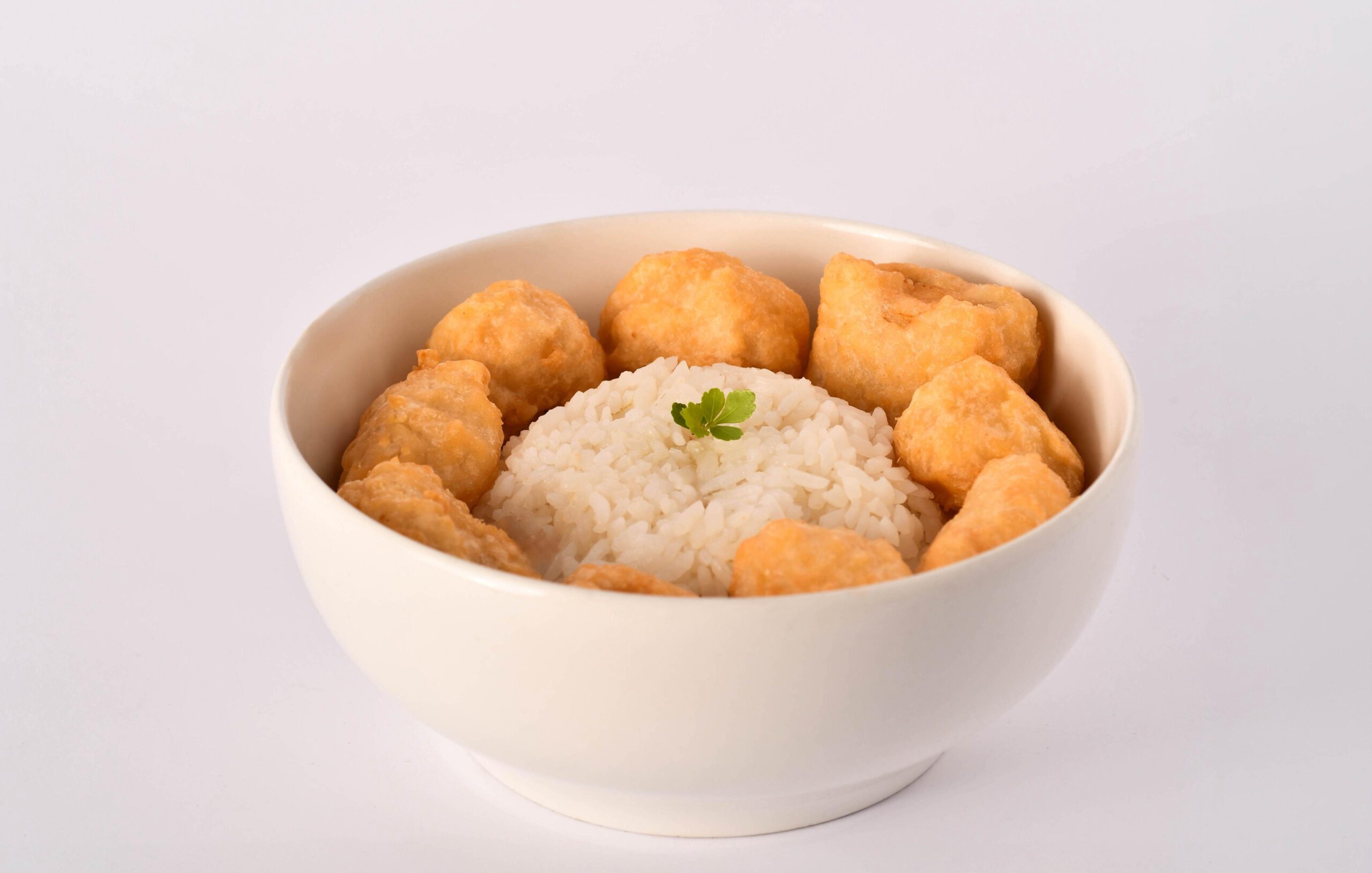 Нежное филе рыбы в хрустящей темпуре с гарниром из приправленного риса (детское блюдо).