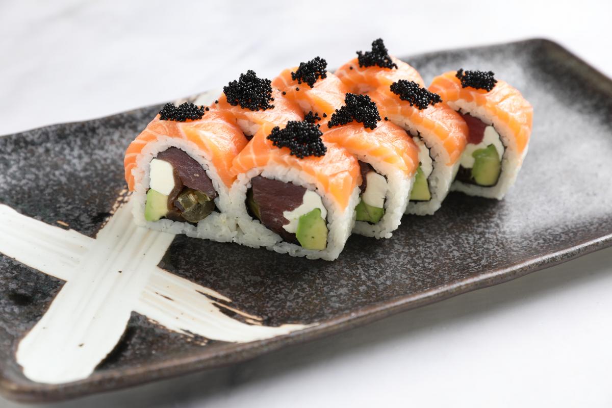 Свежий тунец, авокадо, перец чили, сыр “Филадельфия”канпио ирит  покрыт сыром с лососем. без черного тобико.