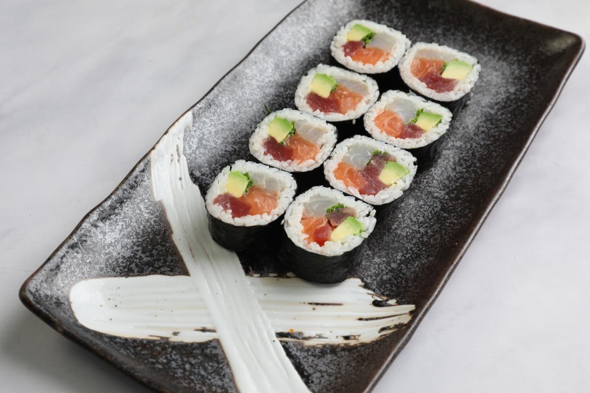 Нежный лосось, свежий тунец, дорадо авокадо, зеленый лук