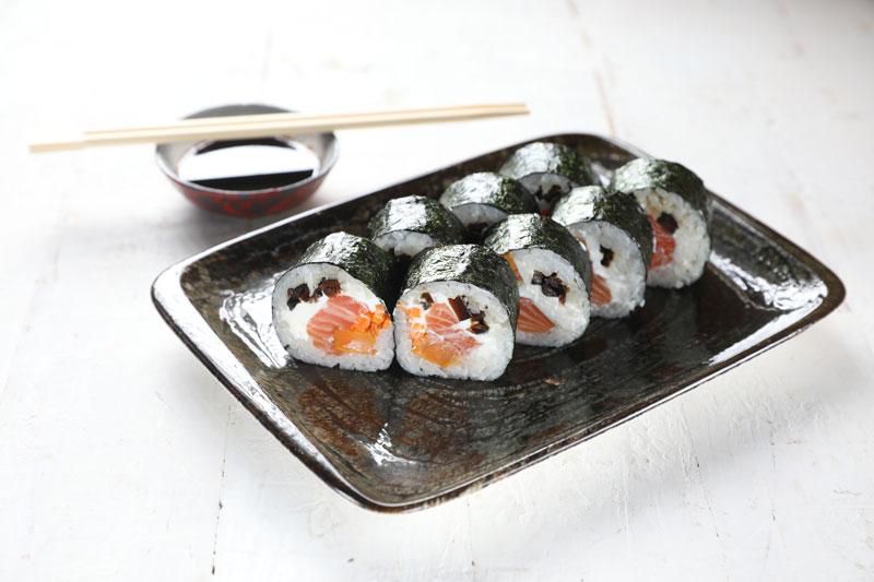 Классический ролл с нежным сырым лососем, грибами шиитаке, сочной морковью, сладким бататом и кремовым сыром Филадельфия.